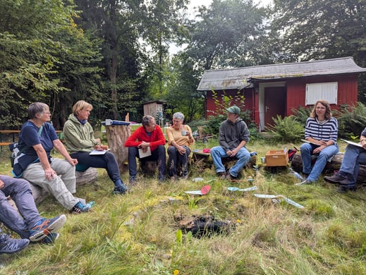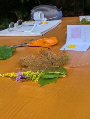 Was Ella Krapf an diesem warmen Nachmittag für die 15 Naturliebhaber dabei hat, passt in eine kleine Kiste: Ein paar Farben, Pinsel, leere Blätter und etwas Anschauungsmaterial … Alles Dinge, die den Kursteilnehmern eher Respekt, wenn nicht gar Angst einflößen, denn fast alle waren anfangs davon überzeugt, dass sie wirklich nicht zeichnen können. Ca. 5 unglaublich kurzweilige Stunden später hatte dann jeder eine Pflanze seiner Wahl auf einer Seite mit Zeichnungen, Daten und emotionalen Bemerkungen näher kennengelernt. Das Ergebnis konnte sich sehen lassen und wurde gemeinsam gewürdigt. Aber das war dann gar nicht mehr wichtig. Auf dem Weg zum ersten Eintrag in das eigene Natur-Tagebuch erfuhren die ca. 15 Teilnehmer, die sich wunderbar sympathisch und stressfrei angeleitet von Ella Krapf immer wieder auf Ungewohntes einlassen mussten, dass es beim „Nature Journaling“ eigentlich nur nebenbei ums Zeichnen geht. Es geht vielmehr darum, wie intensiv – mit allen Sinnen und vielen Gedanken im Kopf - man schon die alltäglichsten Naturschätzchen erleben kann, sei es eine angeknabberte Haselnuss, eine samenbesetzte Brennnessel, ein Stück bemoostes Totholz oder einen Acker-Schachtelhalm.