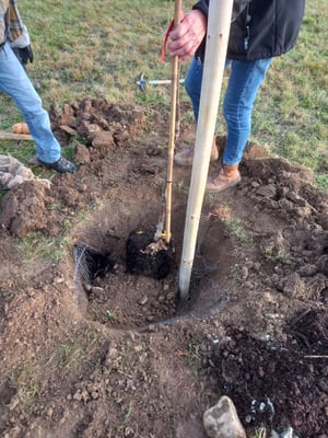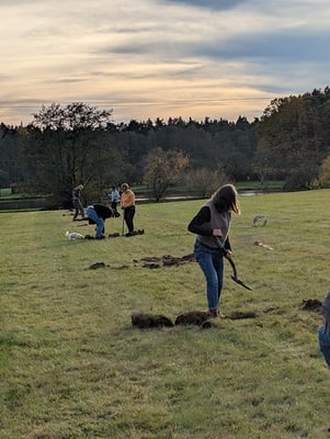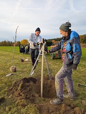 Streuobstwiesen, die bis zu 5.000 Tier- und Pflanzenarten einen Lebensraum bieten können, sind Hotspots der Artenvielfalt und für die Ortsgruppe des Landesbunds für Vogel- und Naturschutz Weiden/Neustadt damit etwas, wofür es sich lohnt, die Ärmel hochzukrempeln. Deshalb rückten am 31.10.25 fast ein Dutzend ehrenamtlich Aktive und Neustädter Helfer - begleitet und überwacht von Hündin "Fritzi" - mit einfachem Gerät, aber viel Begeisterung und Freude am Naturschutz an, um auf einer Fläche des LBV in Altenstadt einen ersten Schritt in Richtung mehr Lebensraumschaffung zu erbuddeln. Dafür wurden auf einer bis dahin eher artenarmen Wiese für Apfel-, Birn-, Walnussbäume und Kirschen eine lange Reihe großer Löcher gegraben, in denen Bäumchen dann gut geschützt vor Wühlmäusen und Verbiss heranwachsen können.