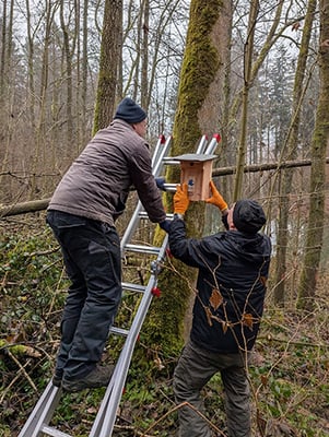 Die Stadt Weiden gab schnell ihre Erlaubnis und nur wenig Tage später gingen dann die vier Naturfreunde, die zwei LBVler und Jan Seibert und Patrick Schmidthammer von der Stadtgärtnerei schon ans Werk. In Hans Heinrichs privater Werkstatt waren passende, stabile Holzkästen schnell und naturschutzfachlich korrekt gefertigt. Am 3.2.25 wurden die relativ großen und schweren Nistkästen dann bereits von den Stadtgärtnereimitarbeitern angebracht. Die beiden LBVler standen mit ihrem Rat zur Seite. Das Aufhängen gestaltete sich gar nicht so einfach. So stand Jan Seibert in seiner wasserdichten Arbeitshose mehrmals knietief in der eiskalten Naab zusammen mit seinem Kollegen Patrick Schmidthammer.