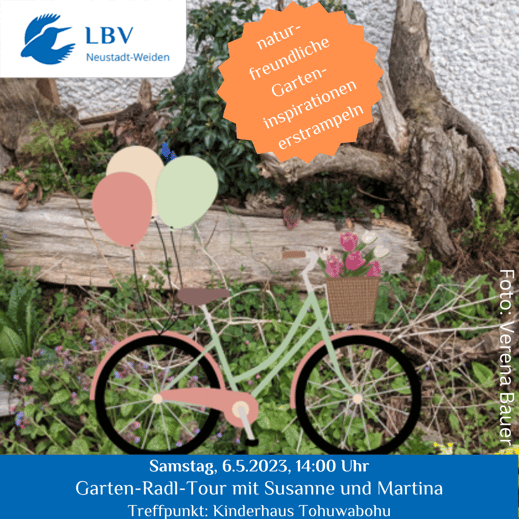 Diesen Blick über die Gartenzäune will der LBV am kommenden Samstag, den 6.5.23 ab 14:00 Uhr allen Interessierten öffnen. Wir starten am Kinderhaus Tohuwabohu in Weiden und radeln ein ganzes Stück von Garten zu Garten ... jeder so weit wie er möchte. Motorlose und E-Bikes sind explizit willkommen!
