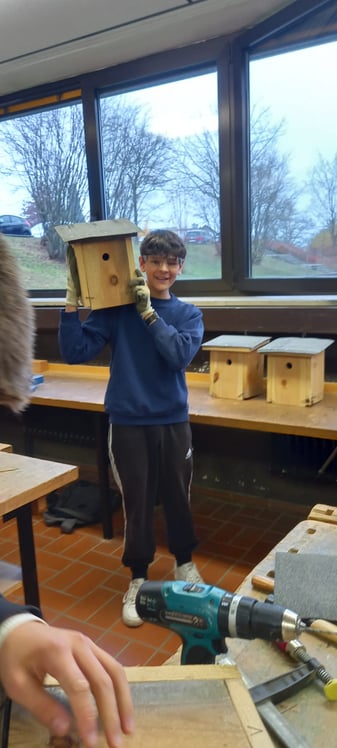 Inspiriert durch die Nistkastenaktion soll aber nur noch mehr auch für Vögel und für das Wissen der Schüler*innen über die gefiederten Windischeschenbacher gemacht werden: Eine Futterstelle im Schulinnenhof soll verschiedene Vogelarten anlocken, die man dann näher kennenlernen kann und in einem der großen Nistkästen, die Hans Heinrich mitgebracht hat, wird eine Kamera installiert.