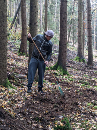 Die im Waldgestrüpp verhedderten Netze mühevoll wieder einbringen. Die Masse aus Blättern, Samen, Ästen und Nadeln durch einen riesigen selbst gebauten Sieb filtern - auf einem Anhänger mit Hand - und dann noch den Waldboden neben der Fichtenmonokultur vorbereiten.