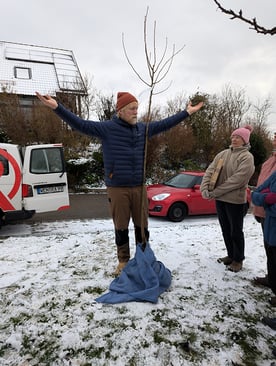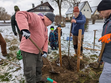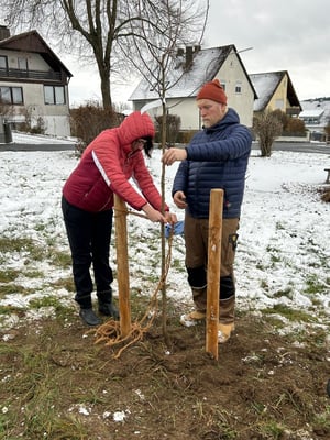 Ein schönes verfrühtes Weihnachtsgeschenk war aber auch, dass an diesem kühlen Samstag nicht nur gepflegt, sondern auch gepflanzt wurde: Zwei furchttragende Bäumchen: Eine Zuckerbirne, für Vögel und Nachbarn, und eine Eberesche, deren Vogelbeeren vor allem den gefiederten Freunden schmecken sollen. Auch hier konnten die Teilnehmerinnen und Teilnehmer von den Tipps und Kniffen der Profis Philipp Glaab und Carsten Lenz profitieren: die richtige Lochtiefe, Pfahlrammeneinsatz und Flechttechnik beim Absichern helfen dem Bäumchen. Die kommen wohl bei zukünftigen Pflanzen privat und beim LBV nun öfter fachgerecht zum Einsatz.