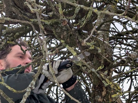 Glücklich trotz Kälte, roter Nasen und kaum mehr spürbarer Zehen waren am Ende aber auch die Teilnehmer, denn sie packten kräftig mit an, balancierten auf Leitern zu kleinen Ästen und machten ganz nebenbei begeisterte Bekanntschaft mit vorher unbekannten Gartenwerkzeugen, wie z.B. der von Philipp Glaab mitgebrachten Schneidgriffe, die nun ganz sicher auch unter dem Weihnachtsbaum einiger teilnehmender Gartenfreunde liegen wird.