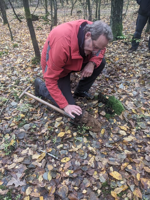 Doch damit hatten die jungen evangelischen Naturschützer offenbar keine Probleme und auch nicht mehr dem Zeitdruck, denn so ein Bäumchen muss in die nährende Erde, bevor die Wurzeln zu sehr trocknen. Nach ca. 2 Stunden war der Großteil der Arbeit schon geschafft und auch auf der zweiten Waldfläche konnten die Konfirmanden erfolgreich auf ihr Tagwerk blicken: In vorher angelegten oberflächlichen Furchen versenkten 5 Wildenreuther Samen verschiedener Laubbäume und verdeckten sie liebevoll mit etwas Erde. Bestaunen konnten sie die Unmenge an Hirschtrüffel, die bei den Arbeiten ans Tageslicht kamen.