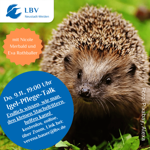 Zuhören kann man ihr diesmal in einem neuen Format, denn es ist nicht einfach nur ein Vortrag. Im Talk diskutiert Eva Rothballer mit Nicole Merbald als "Nachwuchsigel-Retterin", die immer auf der Suche nach Gleichgesinnten ist, die auch ein Herz für die kleinen Stachelritter haben. Der LBV Neustadt-Weiden lädt daher herzlich ein. Der Talk ist kostenlos und findet online über Zoom statt. Den Link gibt es bei verena.bauer@lbv.de
